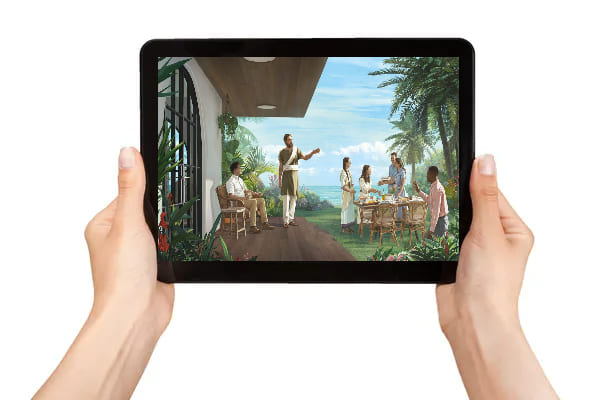 A mesma cena do artigo anterior vista de outro ângulo. Jesus e os 144.000 observam do céu o irmão que está explicando ao ressuscitado o significado da imagem do sonho de Nabucodonosor mencionado no capítulo 2 de Daniel.